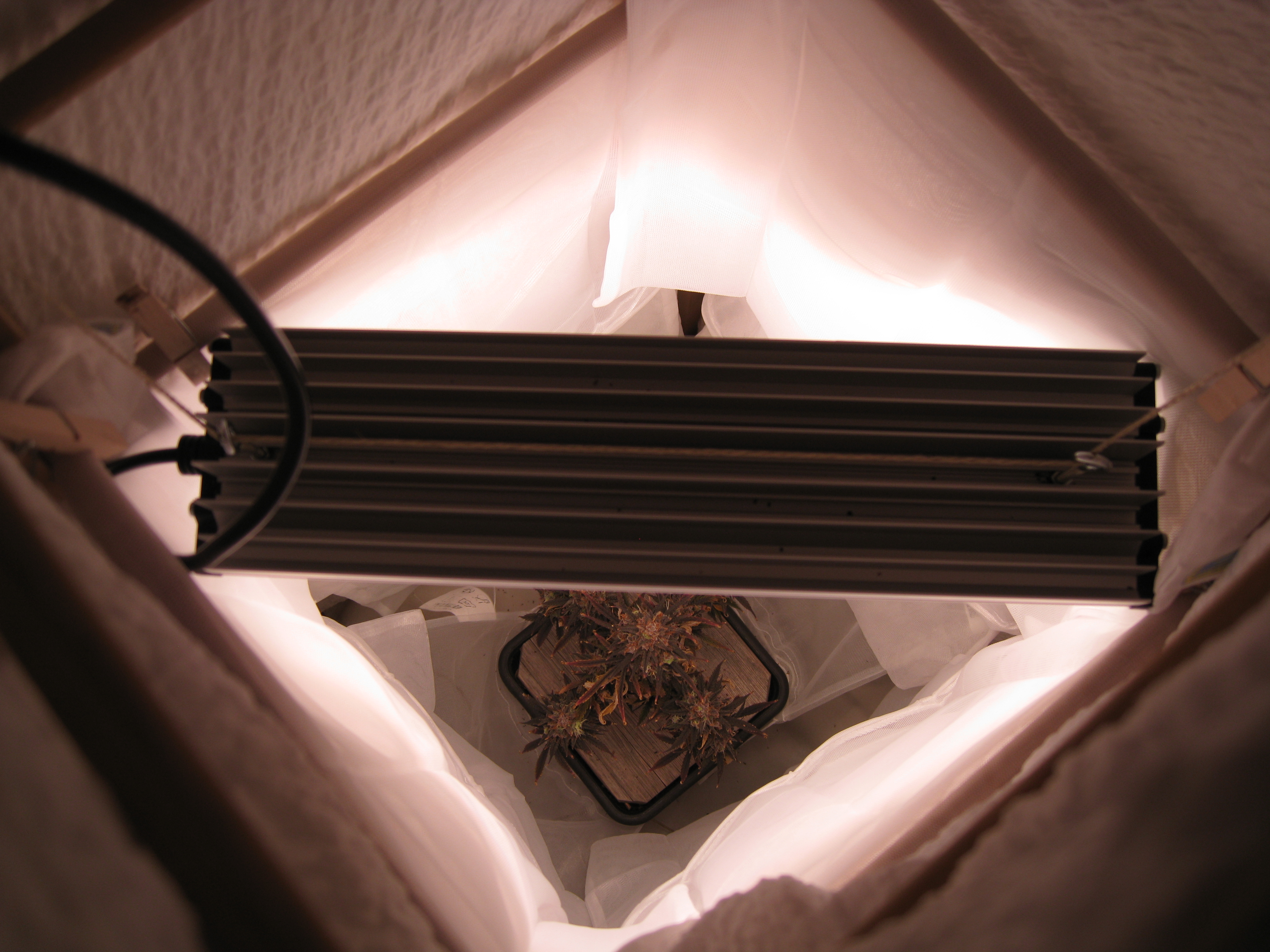 Selbstanbauversuch ( eine Lampe eine Pflanze* / Sanaleo Critical Kush Autoflower ) Kurzanleitung: UV-Schutz Sonnenbrille, "Sanlight Stixx 50" ( Photonen Reaktor :) Pflanzenlampe an dem bsp. "Windhager Holz-Rankpyramide" plus Reflexion in Weiß ± geweisst ( Luminierungsversuche / Kumulieren der Photonen / Verteil - Bündelungsversuche ) umwickelt. Je nachdem mit Styropor ( Agressiver Luftentfeuchter ) verschahlt, jedoch mit "Seilflechter Bootsplane" verkleidet. Erbringt eine erhöhte Photonenflussdichte. Der Sunlight Stixx 50 maximum Verbrauch liegt bei 0,055 kWh. Balkon Ergebnis der Autoflower war = ca. 60 cm groß / 13 Wochen Ernte.